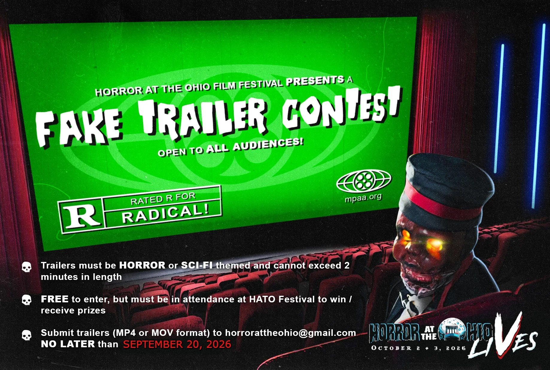 HORROR AT THE OHIO takes place at the historic Ohio Theatre in the idyllic town of Madison, Indiana. What began as a short- and feature-length horror film festival has evolved into a community-wide annual event that celebrates the spirit of Halloween through fun and frights with a small-town feel. Whether you are a diehard horror fanatic or a casual lover of all things spooky, HATO is your Halloween destination. Join us for two nights of movies, music, costumes, trivia, food, merch, and plenty more!